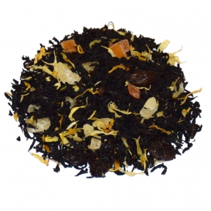Czarna herbata Cejlon, rodzynki, kawałki papai, kawałki ananasa, aromat, kwiatki nagietka.