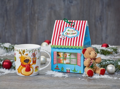 Świąteczny kubek z motywem w renifera z prezentami, wykonany z wysokiej jakości porcelany kostnej New Bone China. Kubek w zestawie z małym pluszowym misiem oraz pudełkiem w kształcie świątecznej chatki z napisem "Merry Christmas".